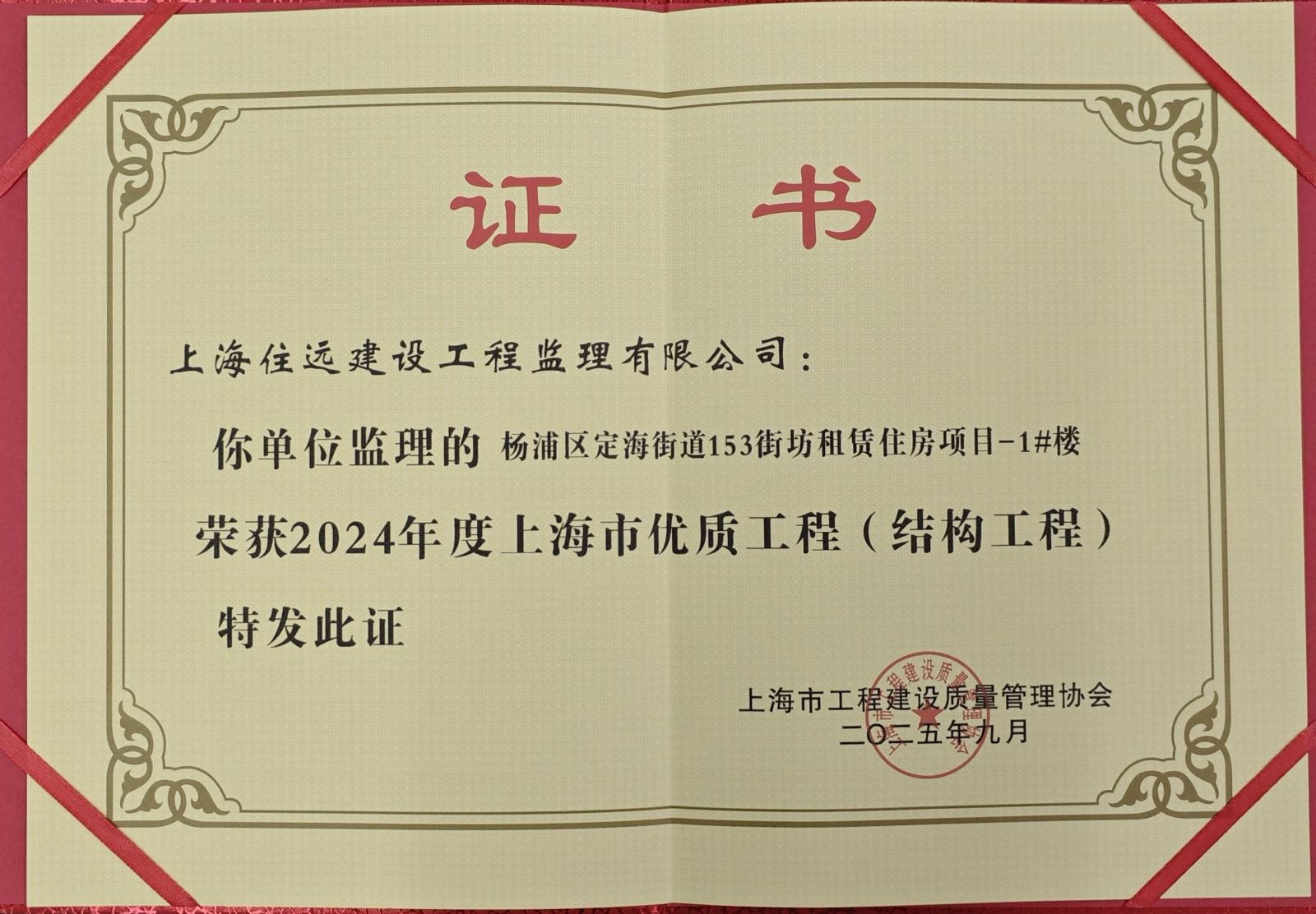 祝贺公司监理的杨浦区定海街道153街坊租赁住房项目-1#楼 荣获2024年度上海市优质工程(结构工程)!